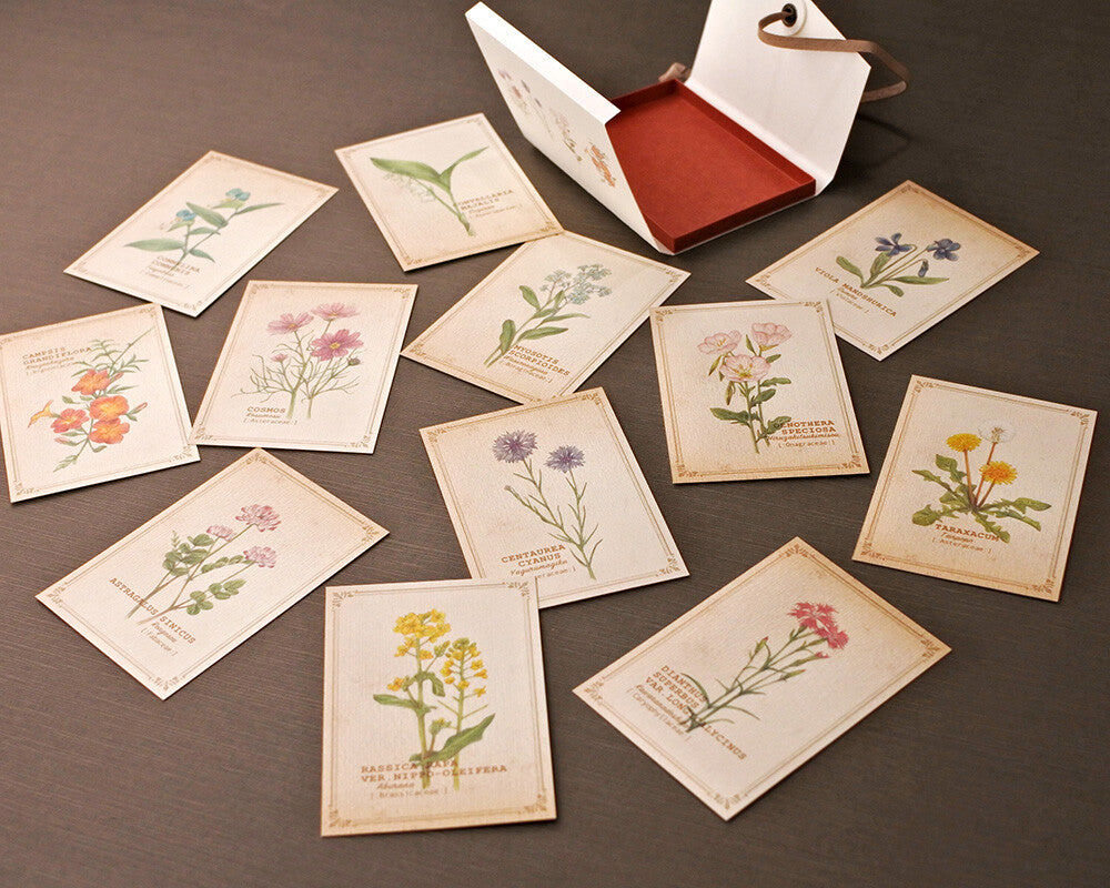 Vintage illustrated encyclopedia inspired note cards in a paper case, featuring original water colour illustrations by the Fukuoka-based Morino Design Laboratory