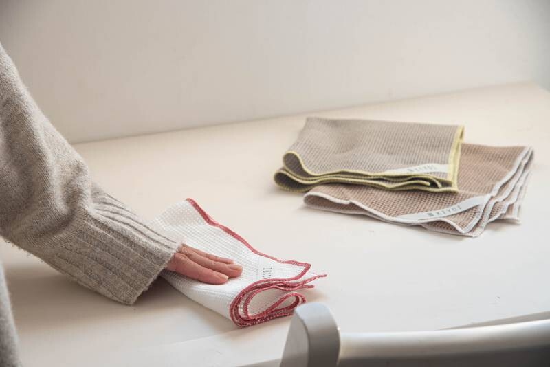 布帛と比較しても、吸水量が多く、たくさんの食器を拭くことができ、また生地目も荒いので乾きが早いです。