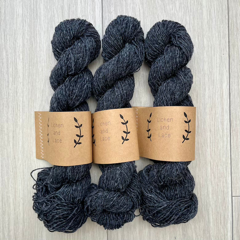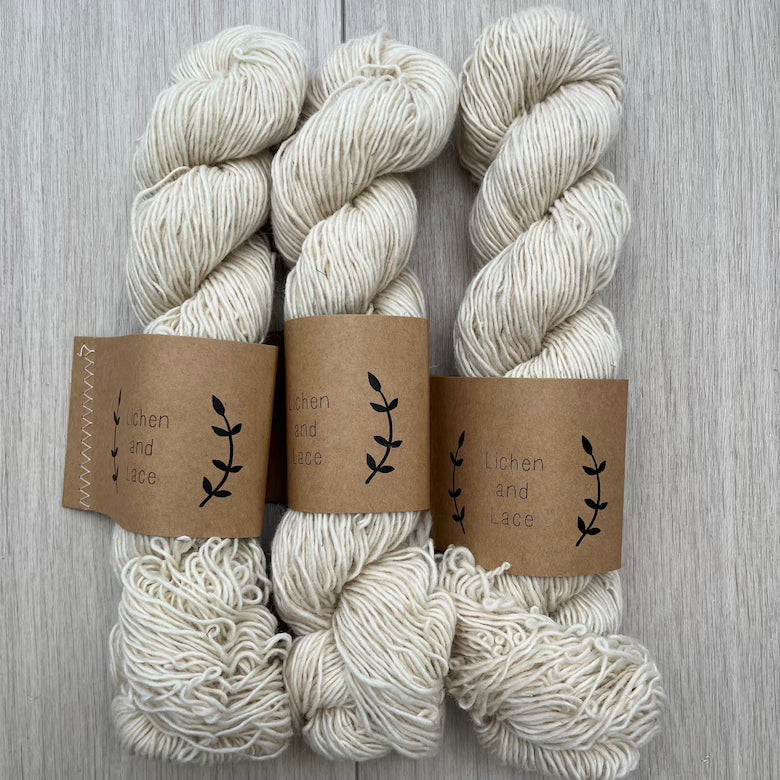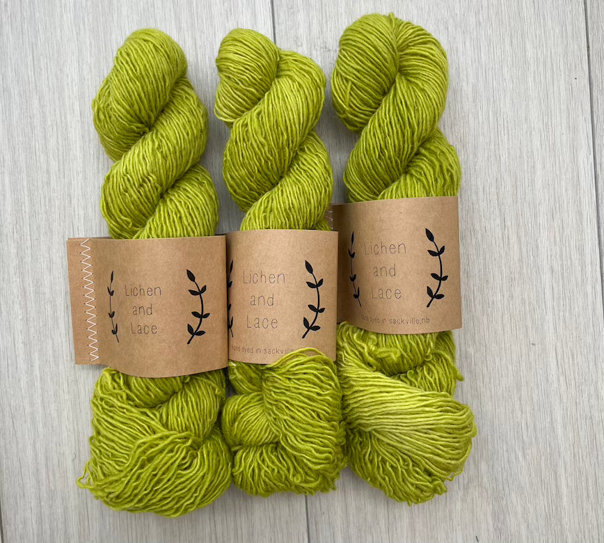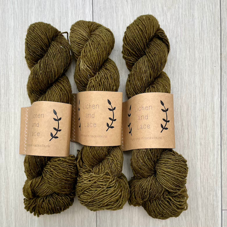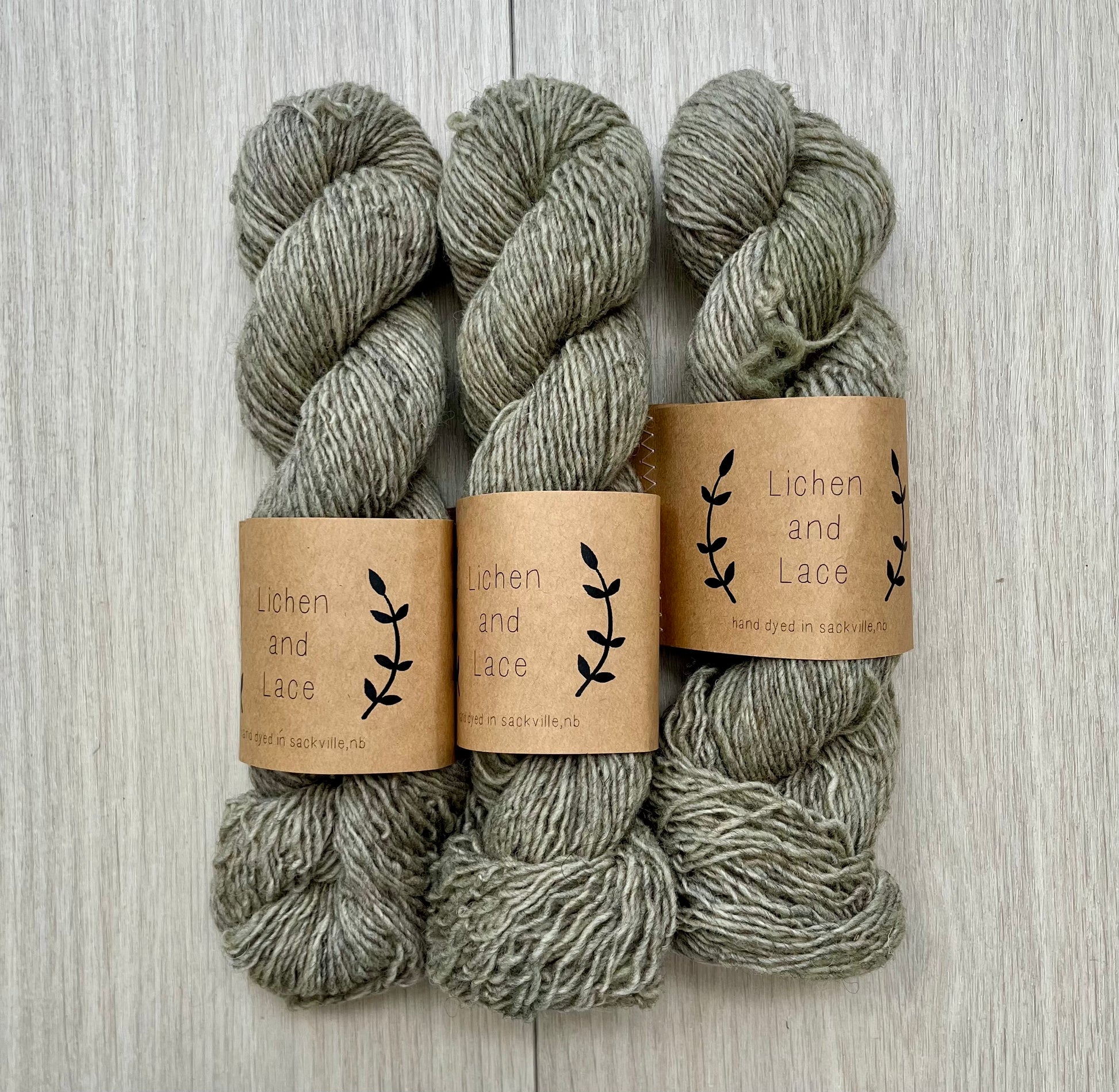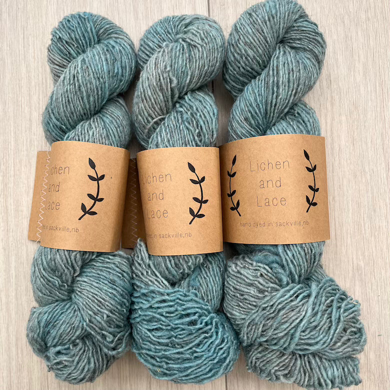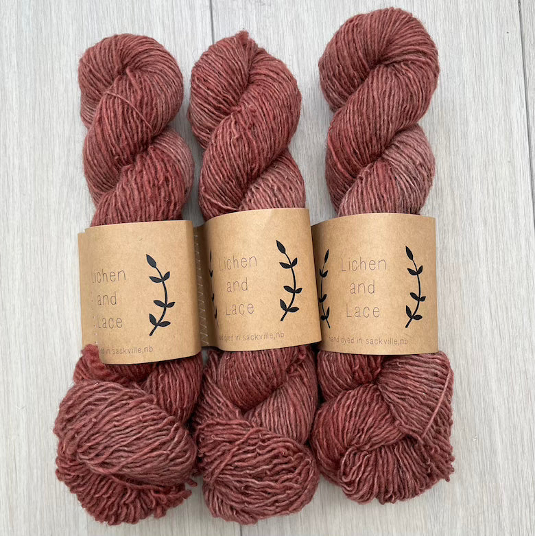 最小限の加工(スーパーウォッシュ加工なし)を施した、素朴な風合いのスポーツウェイト糸。カナダ産ウールを使用し、カナダ最古のウール工場であるニューブランズウィック州の工場で紡績。色はLichen and Laceが丁寧に手染め。