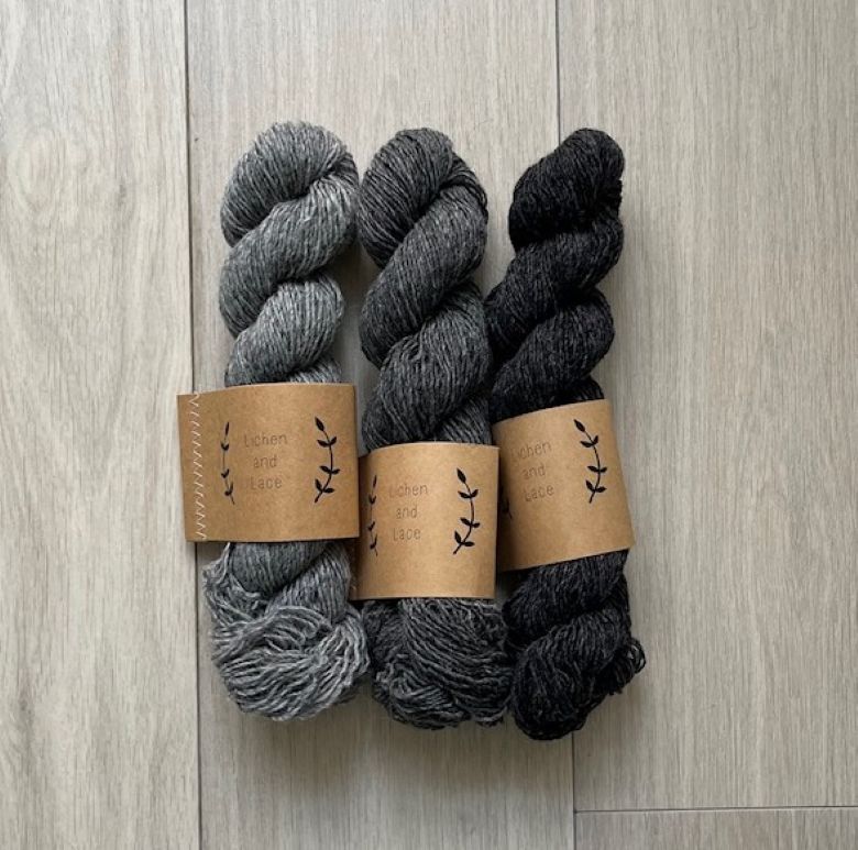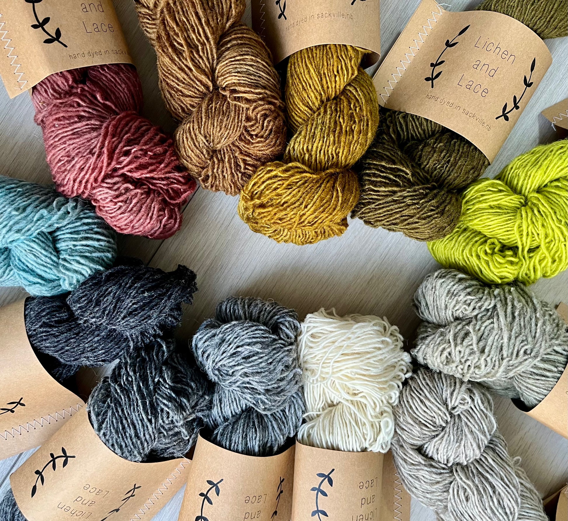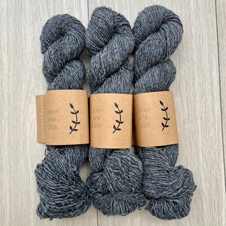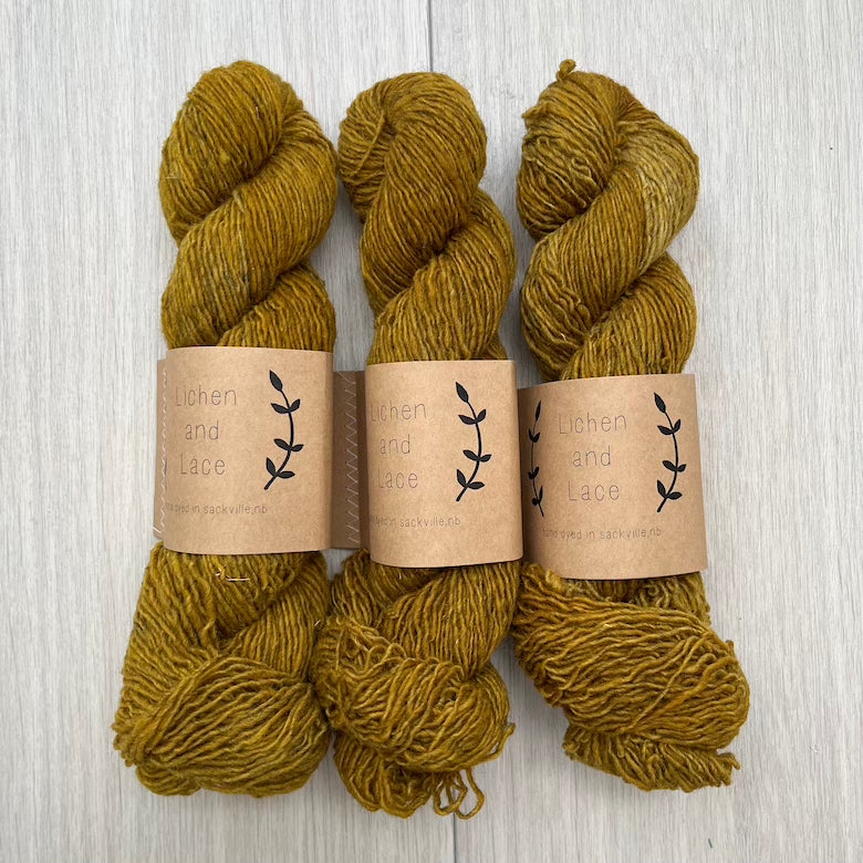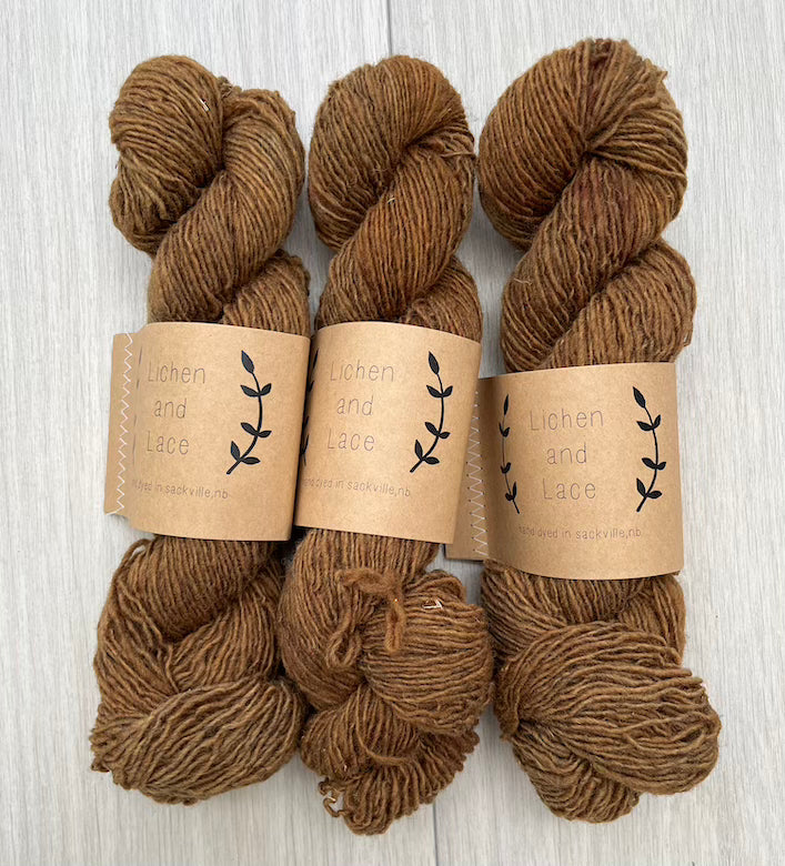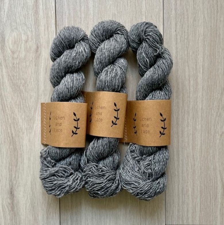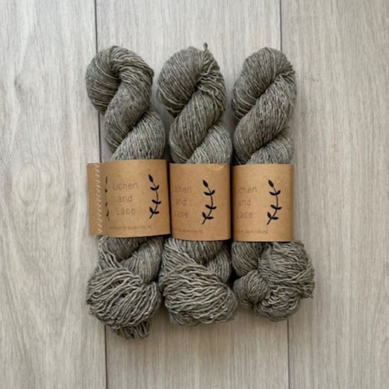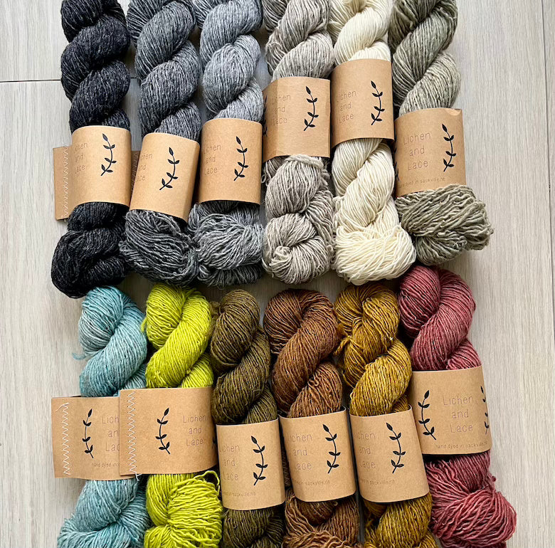 最小限の加工(スーパーウォッシュ加工なし)を施した、素朴な風合いのスポーツウェイト糸。カナダ産ウールを使用し、カナダ最古のウール工場であるニューブランズウィック州の工場で紡績。色はLichen and Laceが丁寧に手染め。