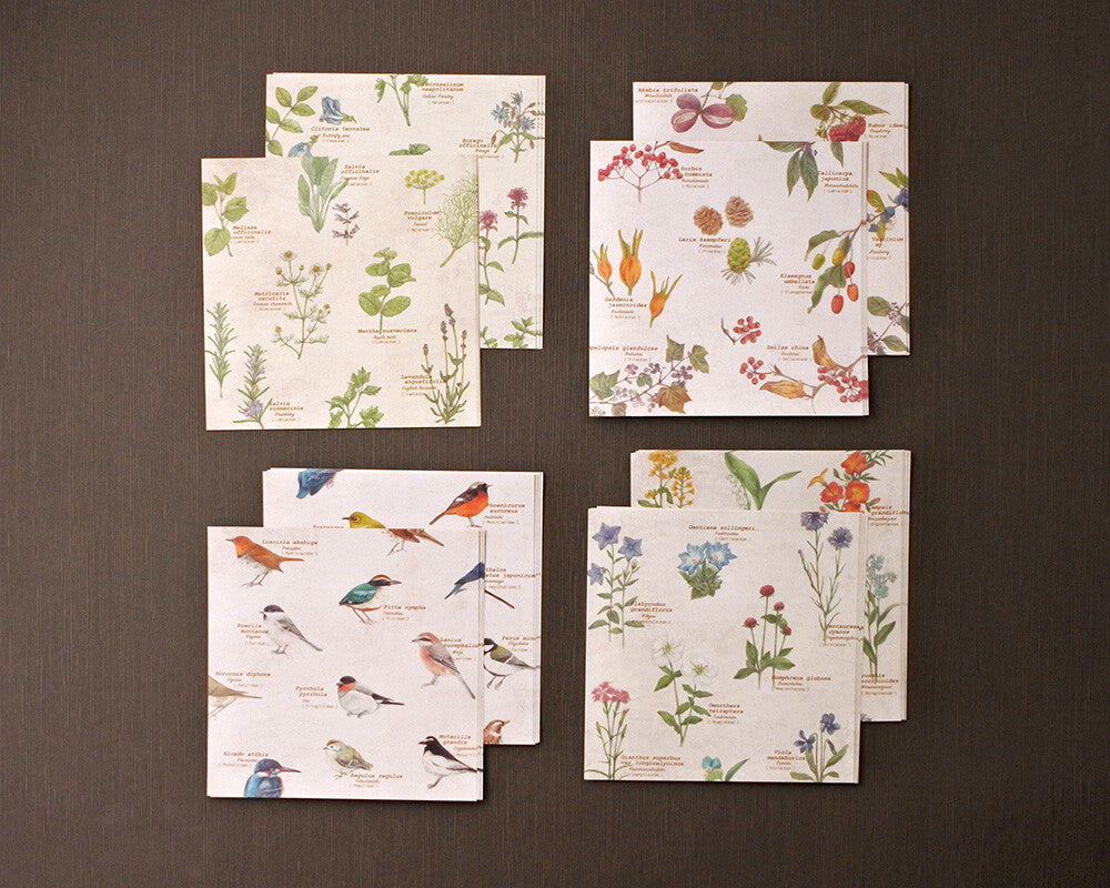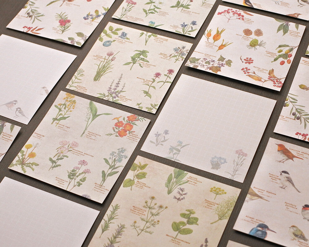 メモ用紙にも使えるミニ便箋は〔野の花、野鳥、木の実、ハーブ〕をモチーフにした絵柄が32枚入って、裏面にはアイボリーに白い線の方眼が入っています。