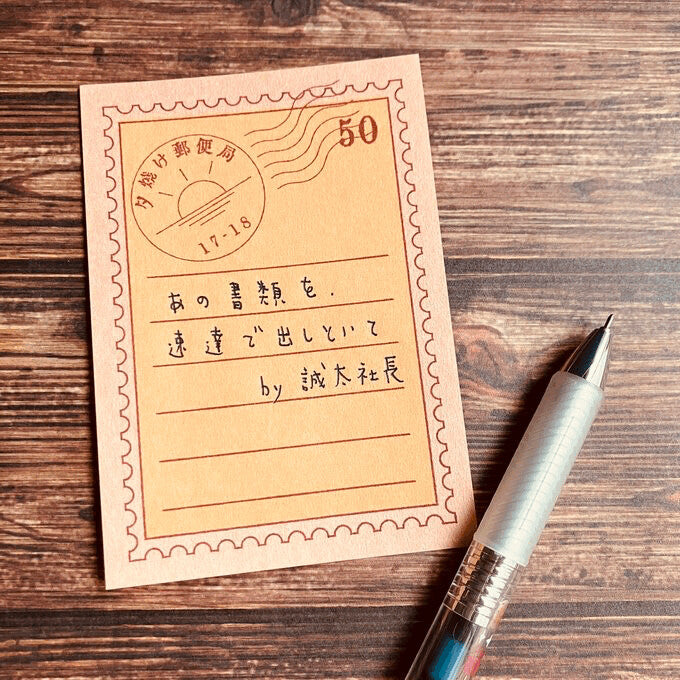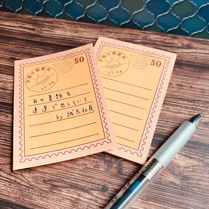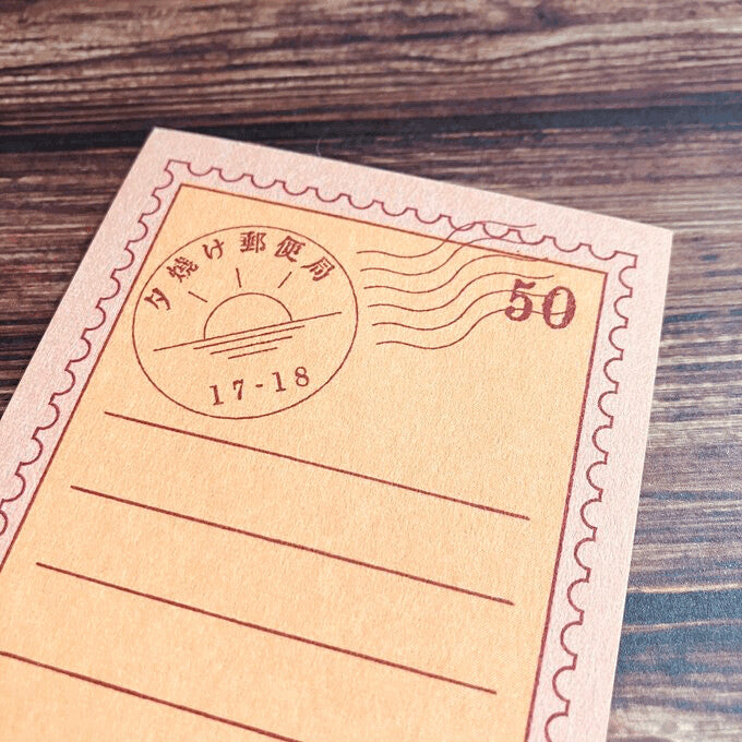 杏色の用紙に橙色がいい感じです。夕焼け切手をモチーフとした一筆箋で、 消印もあしらっております。